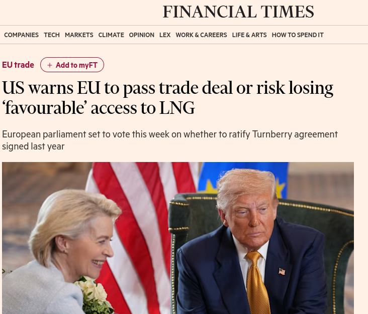 US warns EU to pass trade deal or risk losing ‘favourable’ access to LNG