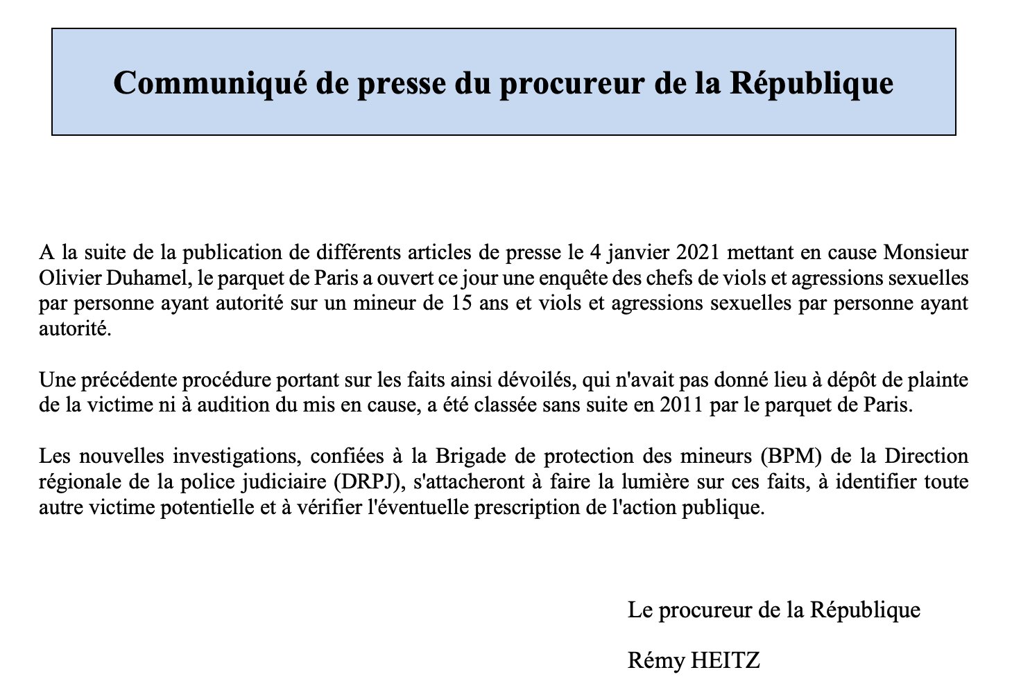 Jusqu’au dimanche 3 janvier, Olivier Duhamel n’était pas au courant de la publication du manuscrit. Sollicité par Le Monde, il n’a pas voulu commenter les accusations portées contre lui : « Je n’ai rien à dire là-dessus. » Lundi après-midi, il a fait savoir sur Twitter qu’« étant l’objet d’attaques personnelles, et désireux de préserver les institutions dans lesquelles je travaille, j’y mets fin à mes fonctions ».