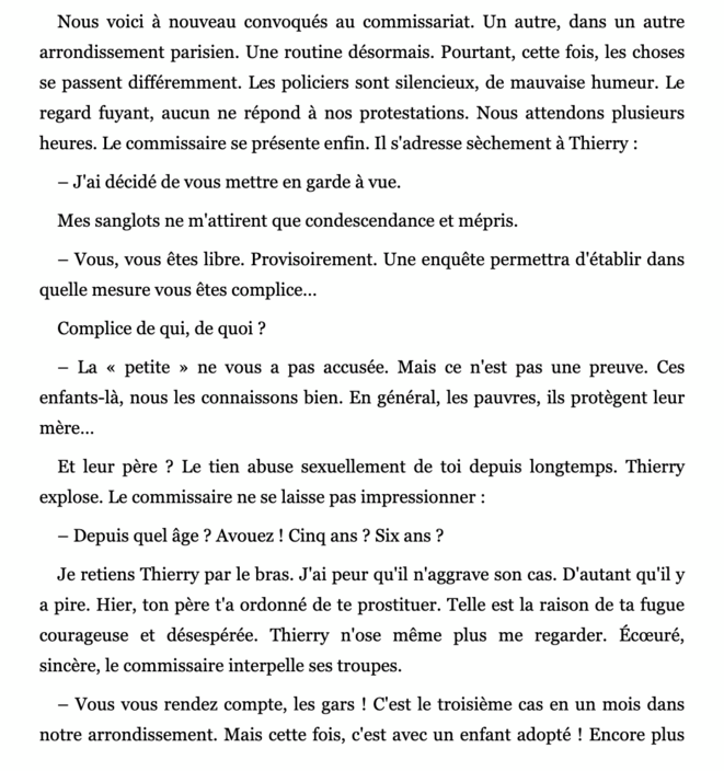 Ils m’ont expliqué que tout le monde savait et ils n’en ressentaient aucune honte. À leurs yeux, c’était simplement une famille qui fonctionnait un peu différemment des autres. Elle faisait parler les habitants du village, mais aussi de la cité populaire de la ville voisine [Meaux]. En fait, cet inceste n’était pas pensé comme un crime, c’était juste « un père qui fait des enfants à sa fille ». Et si tout le monde le sait, et que ce n’est pas un crime, alors à qui voulez-vous que l’on dénonce et que voulez-vous que l’on dénonce ?