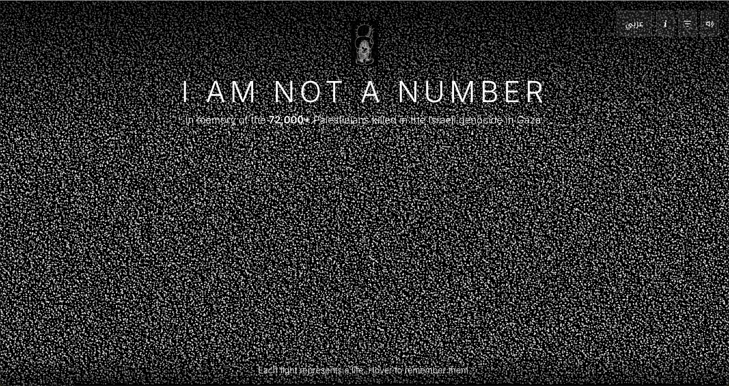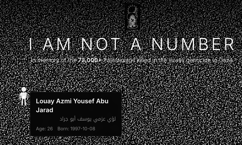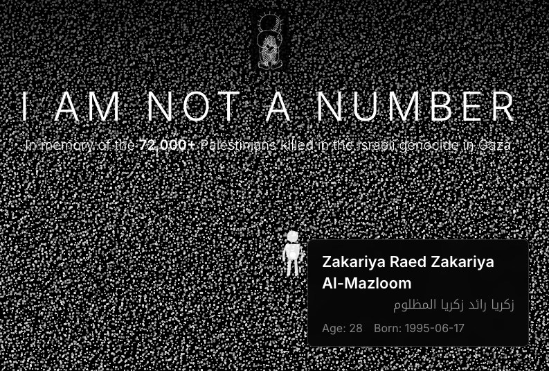 This visual shows the names of 60,199 Palestinians killed by Israeli forces in Gaza from 7 Oct 2023 to 31 Jul 2025. This staggering figure includes only those whose names and ages could be identified by the Ministry of Health in Gaza up to that date. The number as of February 2026 has increased to 73,188+. Thousands of people remain unidentified because their bodies are damaged beyond recognition, they have no surviving family to identify them, or the Ministry of Health in Gaza has been unable to recover their bodies amid the ongoing genocide.