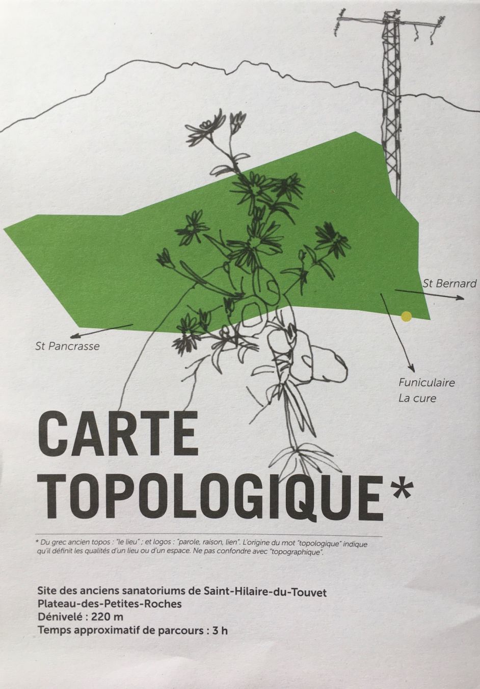 Notre première intuition, pour décaler le regard, a été d’effacer les repères habituels : les routes et les villes pour laisser toute sa place au chevelu hydrographique, même dans ses plus petites ramifications. Nous avons rappelé les noms chantants de toutes ces eaux. Au spectateur attentif de tacher maintenant de se déplacer autrement, en se rappelant là, une confluence, ici, une courbe en angle droit du cours d’eau, et ailleurs la naissance d’un vallon. Nous avons ajouté les reliefs et entités naturelles marquant le paysage, le Glandasse, la Servelle de Brette, le cirque d’Archiane.