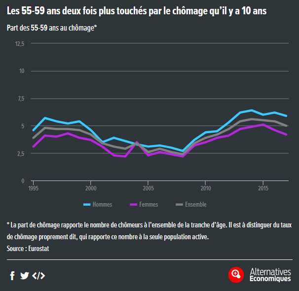 Les 55-59 ans sont également touchés par la dégradation persistante du marché du travail, avec, là aussi, un écart croissant entre les hommes et les femmes. La part de cette tranche d’âge au chômage a doublé entre 2008 et 2017 malgré un reflux sensible depuis 2014.