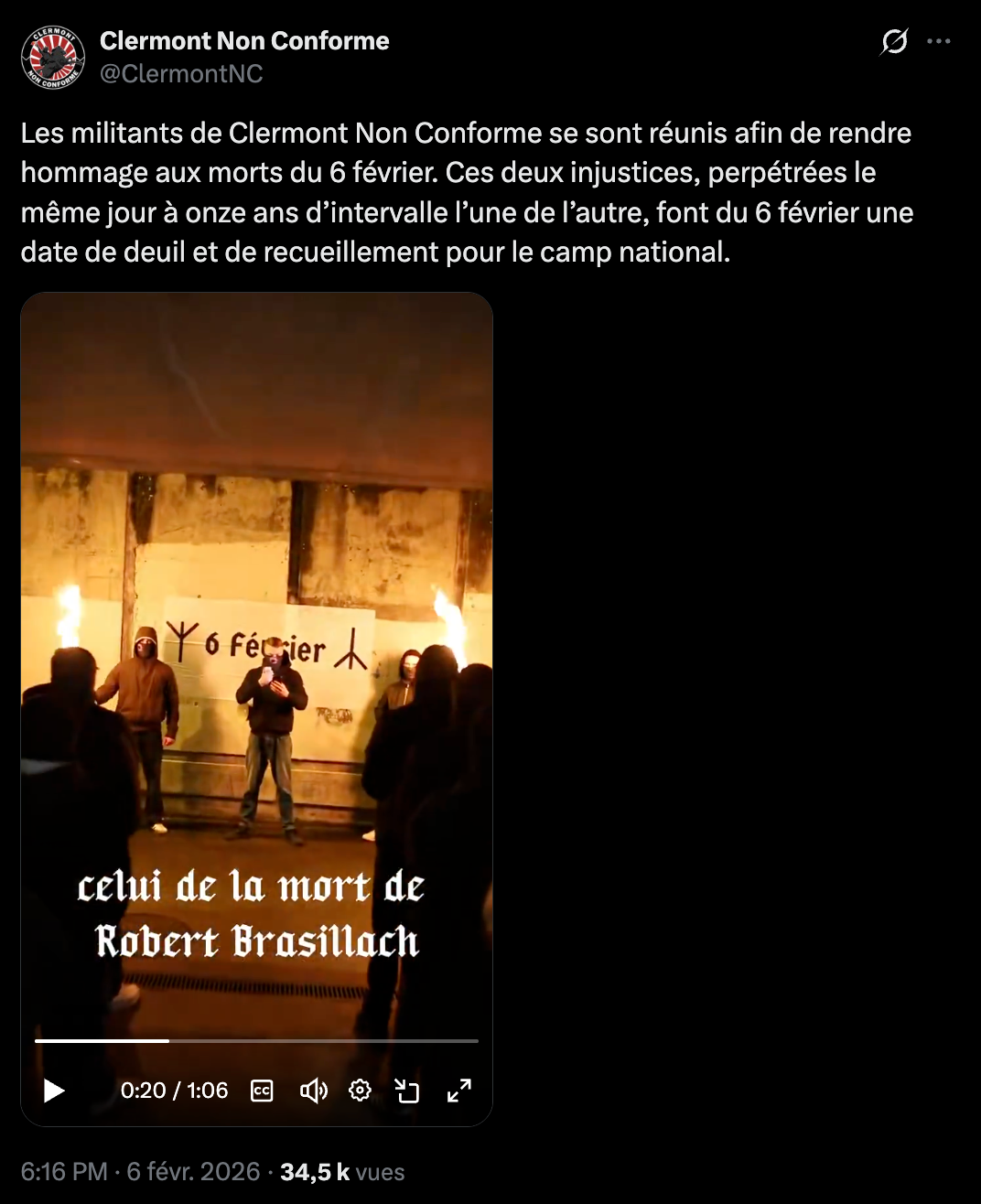 Le média indépendant clermontois Mediacoop a révélé que des militants d’extrême droite, venus de Clermont-Ferrand, étaient présents à Lyon le jour de la mort de Quentin Deranque pour affronter les antifascistes. Ils appartiendraient au groupe néofasciste Clermont non conforme, qui, le 6 février dernier, rendait hommage aux émeutiers du 6 févier 1934 et à l’écrivain fasciste Robert Brasillach, exécuté le 6 février 1945 pour collaboration avec l’Allemagne nazie. Une source fiable a également indiqué à Mediacoop que des militants d’autres villes étaient présents le soir de la bagarre ayant coûté la vie à Quentin. La source a cité les villes de Valence, Besançon, Grenoble et Aix-en-Provence. Des informations que nous n’avons pas pu recouper.