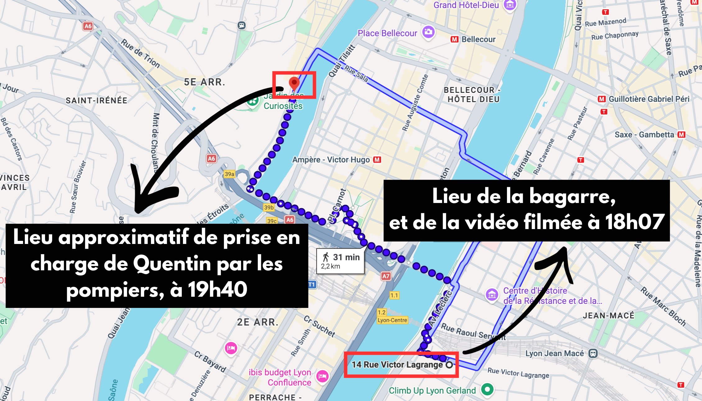 Quentin et son acolyte suivront finalement ces conseils et se rendront dans le Vieux Lyon, quartier de prédilection des militants néofascistes lyonnais, à environ deux kilomètres du lieu de la bagarre. C’est là que Quentin sera finalement pris en charge par les pompiers, vers 19 heures 40, soit une heure et demie après la vidéo tournée à 18 heures 07.