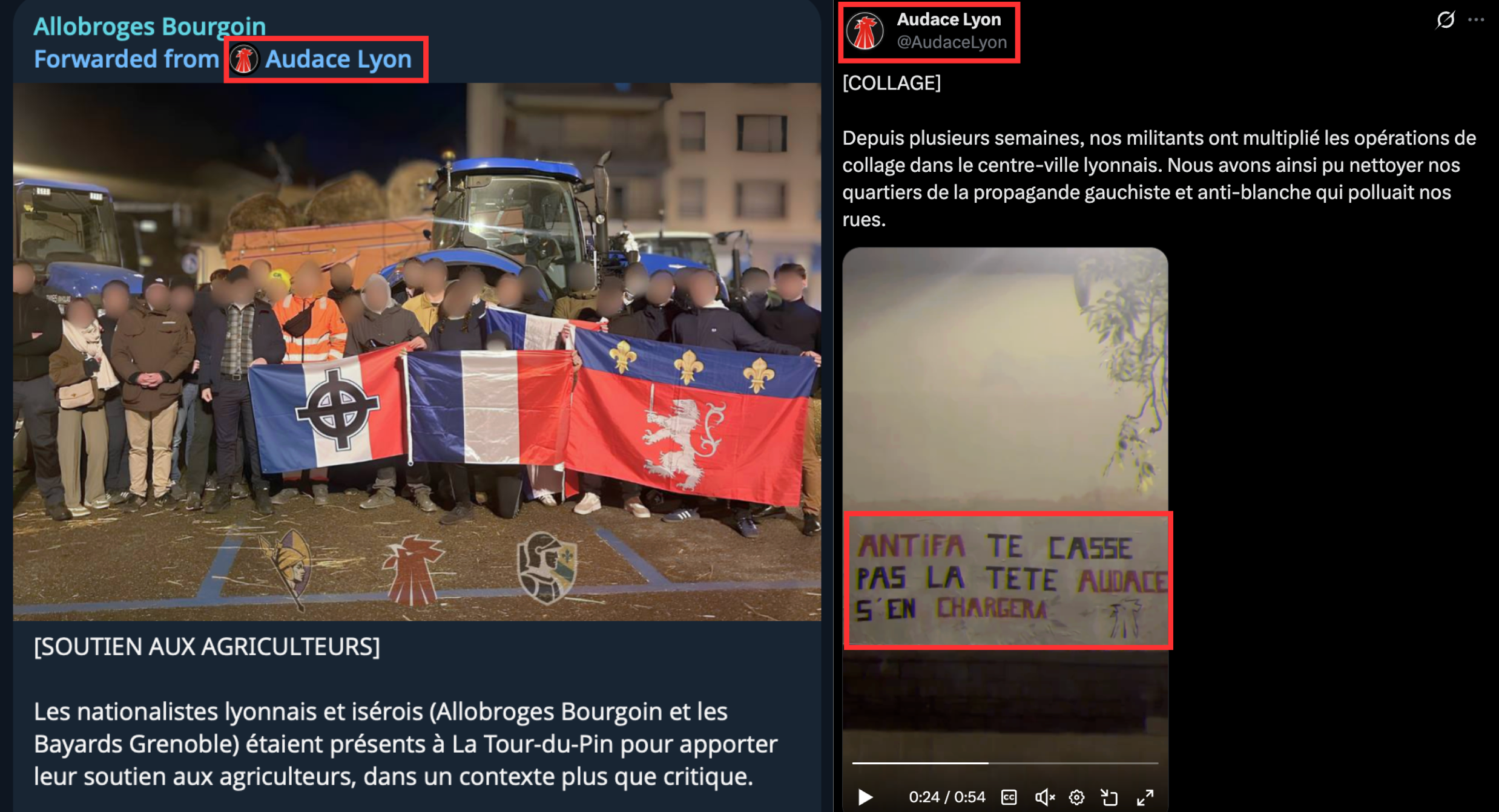 Comme nous le mentionnions dans notre précédent article sur l’affaire, les Allobroges Bourgoin s’affichent ouvertement en compagnie de différents groupuscules néonazis, dont les Hussards Paris et les Active Club. On les retrouvait également, en décembre dernier, aux côtés d’Audace Lyon. Ce groupuscule, qui organise régulièrement des entraînements au combat, auxquels Quentin participait, est dans la tourmente depuis les révélations de l’Humanité sur l’organisation, à l’automne dernier, de guets-apens à l’encontre des antifascistes. En octobre 2025, Audace affichait ouvertement son projet violent en déployant à Lyon une banderole sur laquelle on pouvait lire : « Antifa, te casse pas la tête, Audace s’en chargera ».