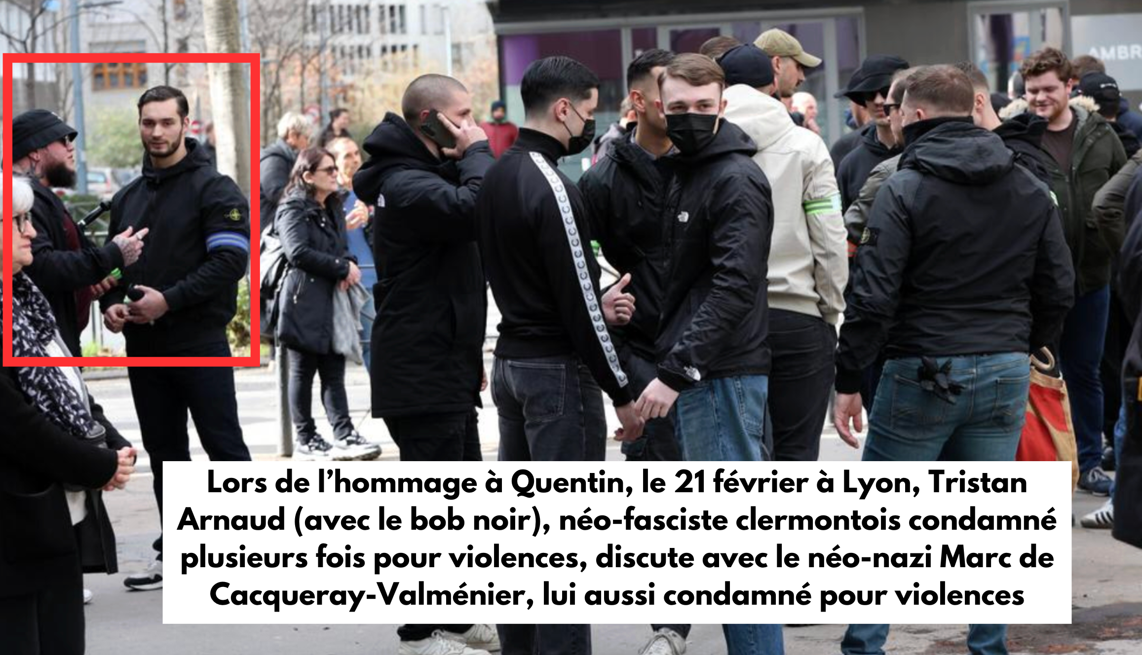 La présence de membres de Clermont non conforme apparaît en tout cas plausible, tant le groupe auvergnat entretient des liens étroits avec les néofascistes lyonnais. Une figure de Clermont non conforme, Eliot V., est un ancien militant de Lyon ayant déménagé dans la capitale auvergnate il y a quelques années. Selon une source antifasciste, Quentin Deranque lui-même se rendait régulièrement à Clermont-Ferrand et apparaîtrait dans des vidéos de Clermont non conforme. Plusieurs membres de cette organisation étaient d’ailleurs présents le 21 février à Lyon au sein de la manifestation néofasciste en hommage à Quentin Deranque. Parmi eux, Tristan Arnaud, figure de la mouvance néofasciste française condamné à plusieurs reprises pour violences, que l’on voit sur des images assurer le service d’ordre aux côtés du néonazi Marc de Cacqueray-Valménier. Des militants du groupuscule violent Vandal Besak ont aussi été reconnus dans le défilé.