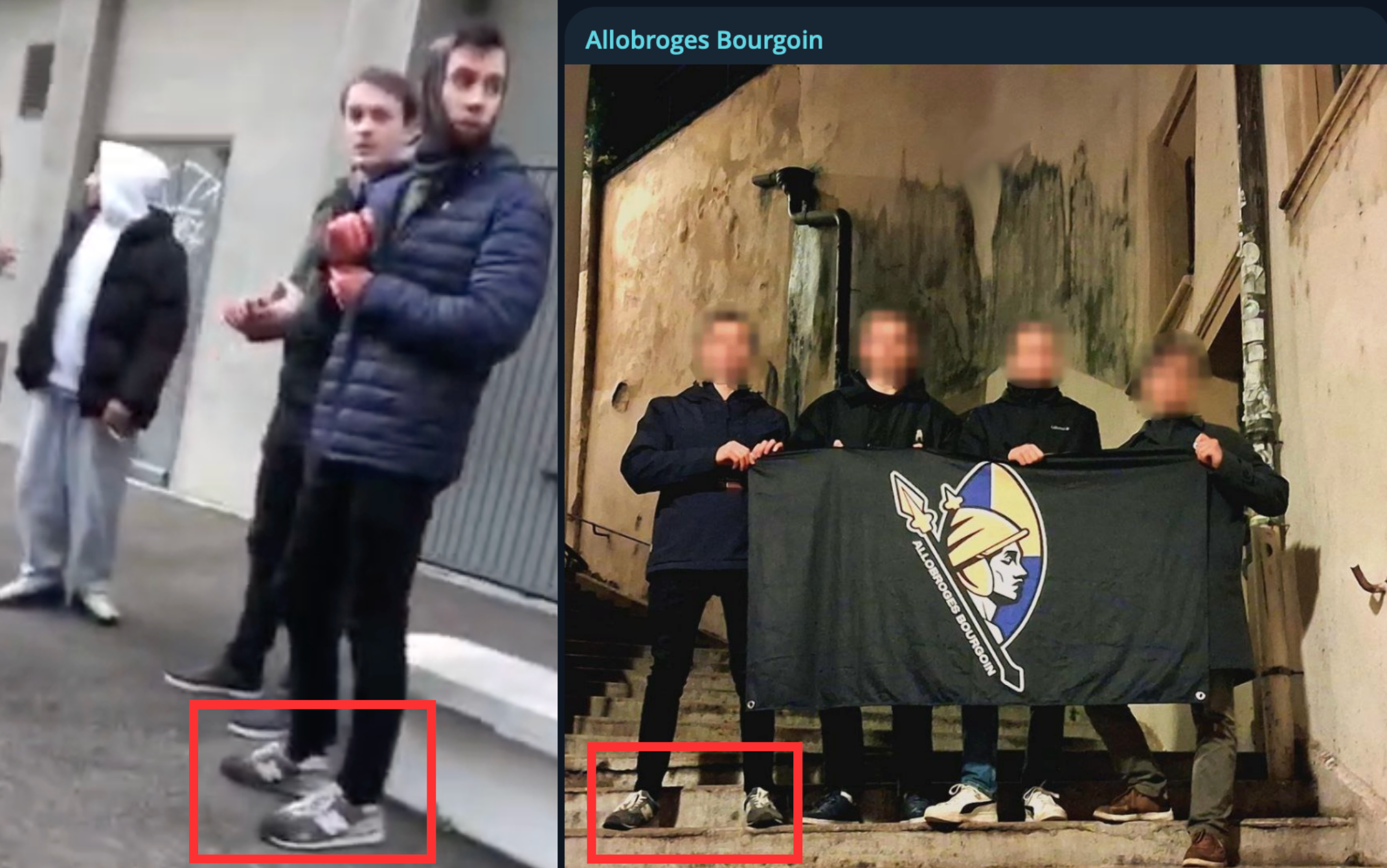 En plus de confirmer la présence de Quentin en première ligne des affrontements avec les antifascistes, cette nouvelle vidéo semble attester son appartenance aux #Allobroges_Bourgoin, un groupuscule néofasciste actif en Isère, qu’il aurait contribué à fonder, selon Le Figaro. Une photo diffusée par les Allobroges Bourgoin sur leur canal Telegram permet d’identifier un jeune homme dont la silhouette et les chaussures correspondent à celles de Quentin Deranque le jour de sa mort.