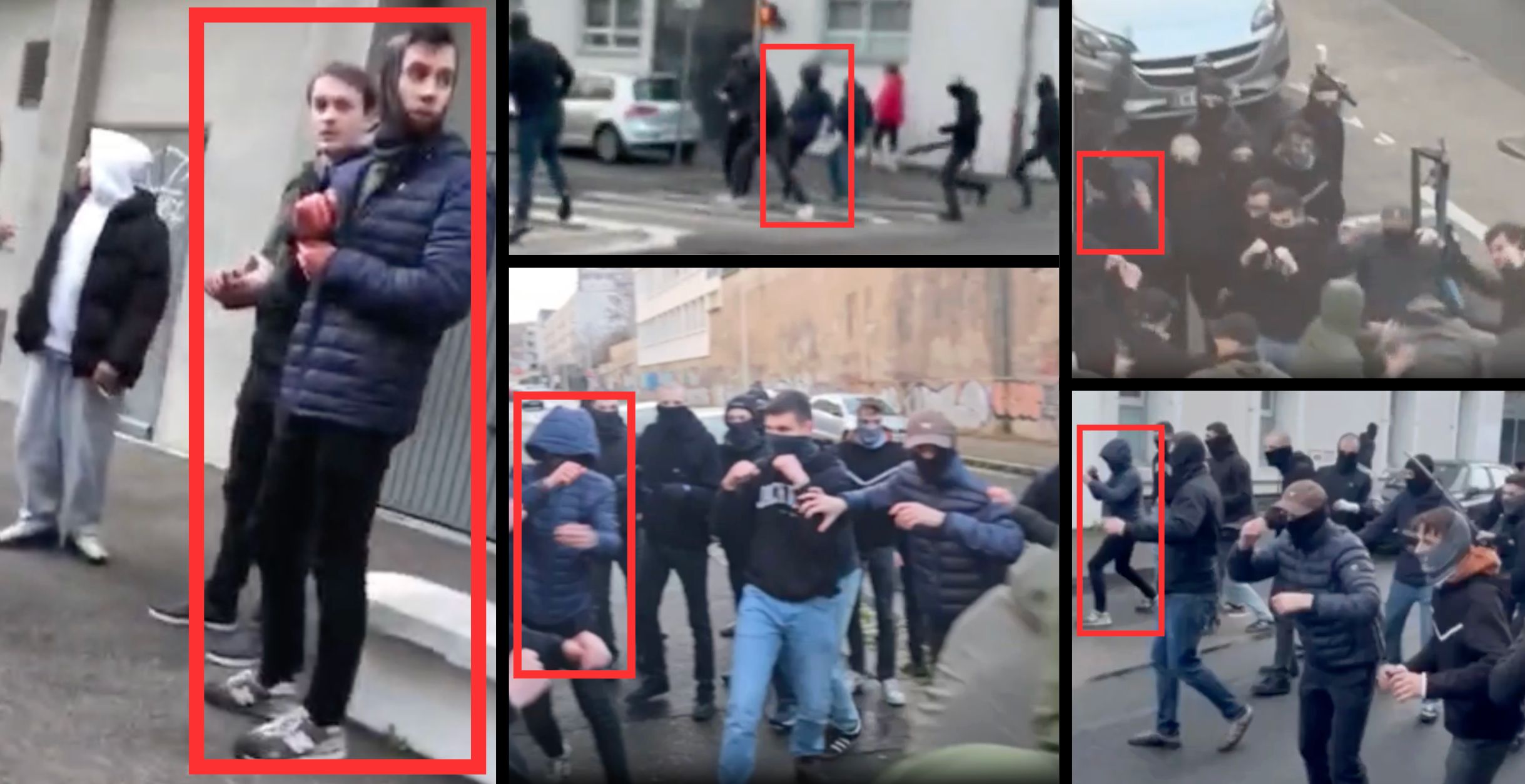 On le distingue sur plusieurs scènes de la bagarre : lors d’une charge en direction des antifascistes, au milieu de l’affrontement à l’angle de la rue Victor Lagrange, et enfin dans cette même rue, utilisée comme axe de fuite par les fascistes, où Quentin Deranque sera frappé au sol. À ses côtés, plusieurs militants d’extrême droite se montrent particulièrement violents. Dans un précédent article, nous mentionnions l’usage par ces derniers d’une béquille, d’une gazeuse lacrymogène et d’un parapluie comme armes. Les images confirment que les personnes manipulant ces objets se trouvaient toutes à proximité de Quentin lors des affrontements.