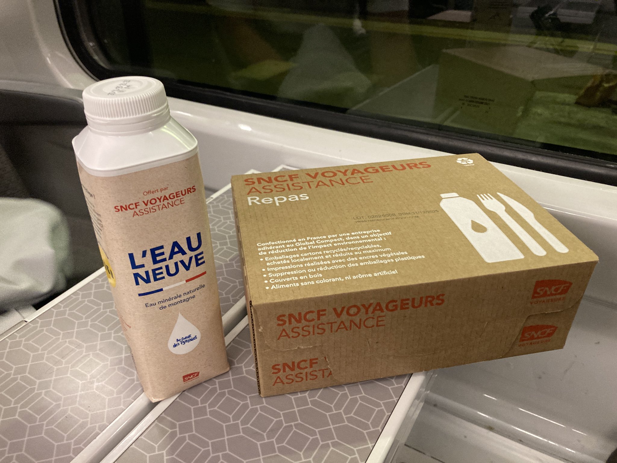 L’autre jour, je prenais mon TER rituel pour un trajet de deux heures. Installé, on nous annonce 30 minutes de retard. Une heure après, des agents pas très jouasses de ne rien savoir de plus, nous assurent que le « problème technique » va être résolu. C’est le dernier train, pas d’alternative, sauf à annuler mon séjour. Une demi heure plus tard, on reçoit un panier repas. Je découvre « l’eau neuve » qu’elle est tricolore, sans doute depuis les Mérovingiens.