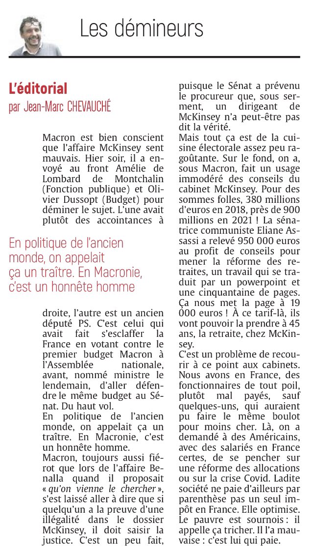 Contrairement à ce que dit Macron, ce que le Sénat reproche à McKinsey et aux autres, ce n’est pas l’illégalité des marchés mais l’ingérence du privé dans la prise de décision publique et les factures énormes pour un rendu médiocre… (Libé)