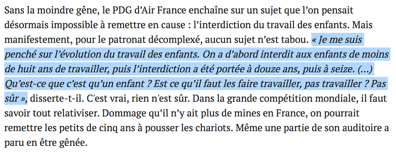 Près d’une heure après le début de la réunion, « plusieurs centaines » de manifestants sont entrés dans le siège d’Air France aux cris de « De Juniac démission » et « On est chez nous ». Le PDG d’Air France, Frédéric Gagey, est sorti précipitamment, indemne. Mais des #salariés ont malmené leur directeur des ressources humaines (#DRH), Xavier Broseta. Sa chemise arrachée, il s’est enfui de la salle de réunion torse nu, entouré d’un important service d’ordre. Après ces événements, Air France a annoncé le dépôt d’une plainte pour « violences aggravées ». Le CCE qui devait reprendre à 14 h 30 ne reprendra pas lundi.